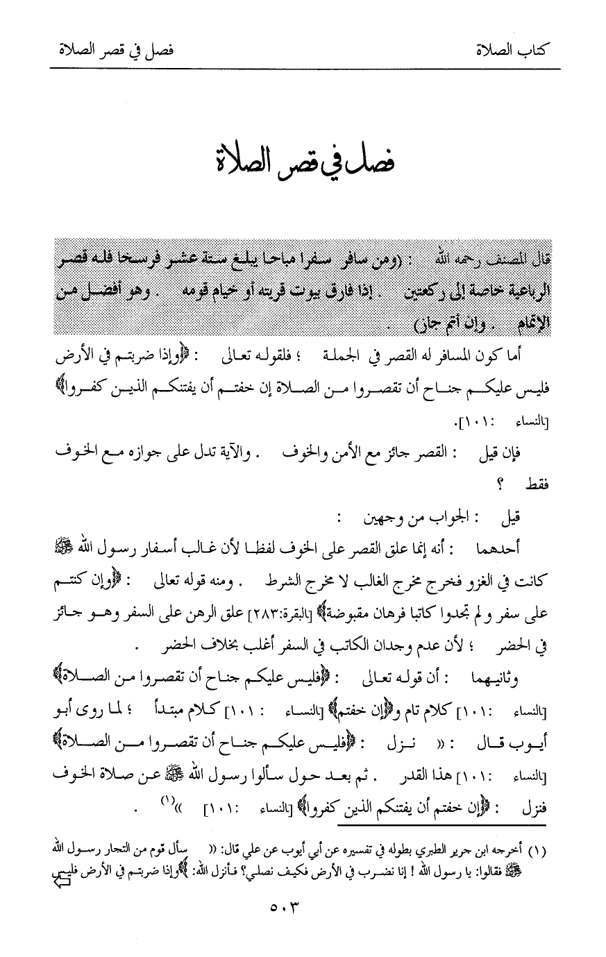 (¬1) أخرجه ابن جرير الطبري بطوله في تفسيره عن أبي أيوب عن علي قال: «سأل قوم من التجار رسول الله صلى الله عليه وسلم فقالوا: يا رسول الله! إنا نضرب في الأرض فكيف نصلي؟ فأنزل الله: {وإذا ضربتم في الأرض فليس عليكم جناح أن تقصروا من الصلاة} ثم انقطع الوحي. فلما كان بعد ذلك بحول غزا النبي صلى الله عليه وسلم فصلى الظهر، فقال المشركون: لقد أمكنكم محمد وأصحابه من ظهورهم هلا شددتم عليهم فقال قائل منهم: إن لهم أخرى مثلها في أثرها. فأنزل الله تبارك وتعالى بين الصلاتين: {إن خفتم أن يفتنكم الذين كفروا إن الكافرين كانوا لكم عدواً مبينا، وإذا كنت فيهم فأقمت لهم الصلاة فلتقم طائفة منهم معك -إلى قوله-: إن الله أعد للكافرين عذاباً مهينا} فنزلت صلاة الخوف» 9: 126.