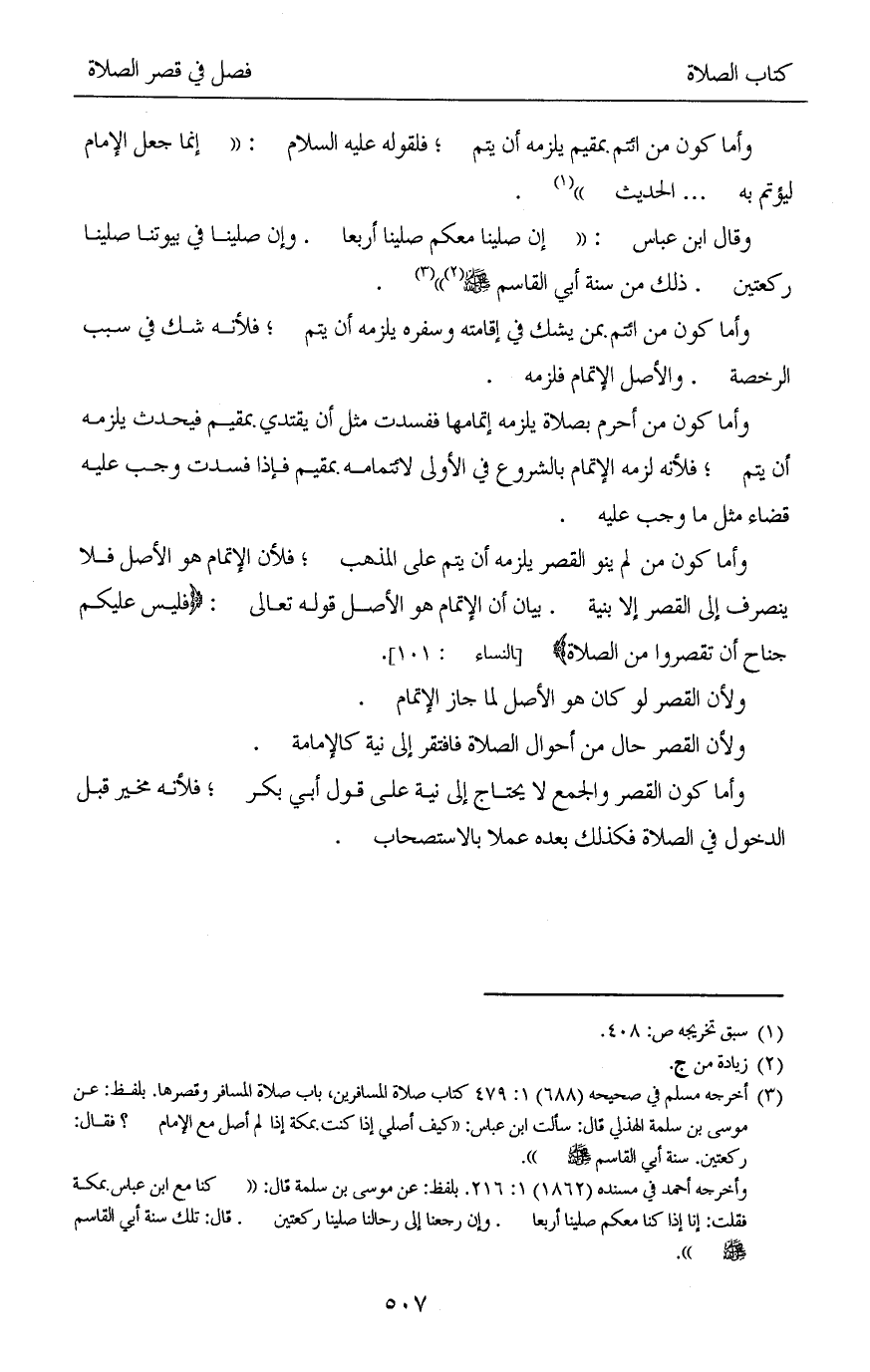 وقال ابن عباس: «إن صلينا معكم صلينا أربعاً. وإن صلينا في بيوتنا صلينا ركعتين. ذلك من سنة أبي القاسم صلى الله عليه وسلم (¬2») (¬3).
