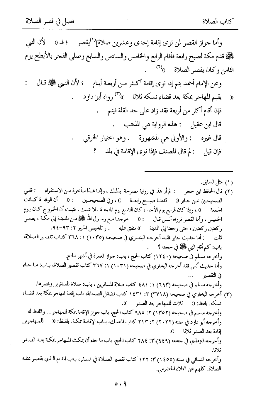 (¬2) قال الحافظ ابن حجر: لم أر هذا في رواية مصرحة بذلك، وإنما هذا مأخوذ من الاستقراء: ففي الصحيحين عن جابر «قدمنا صبح رابعة»، وفي الصحيحين: «أن الوقفة كانت الجمعة»، وإذا كان الرابع يوم الأحد، كان التاسع يوم الجمعة بلا شك، فثبت أن الخروج كان يوم الخميس، وأما القصر فرواه أنس قال: «خرجنا مع رسول الله صلى الله عليه وسلم من المدينة إلى مكة، يصلي ركعتين ركعتين، حتى رجعنا إلى المدينة» متفق عليه. ر تلخيص الحبير 2: 93 - 94.