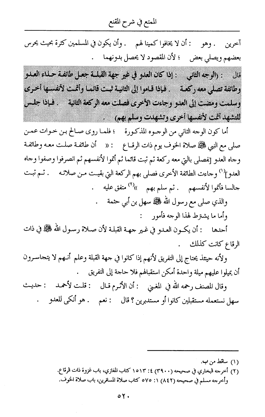 قال: (الوجه الثاني: إذا كان العدو في غير جهة القبلة جعل طائفة حذاء العدو وطائفة تصلي معه ركعة. فإذا قاموا إلى الثانية ثبت قائماً وأتمت لأنفسها أخرى وسلمت ومضت إلى العدو وجاءت الأخرى فصلت معه الركعة الثانية. فإذا جلس للتشهد أتمت لأنفسها أخرى وتشهدت وسلم بهم).