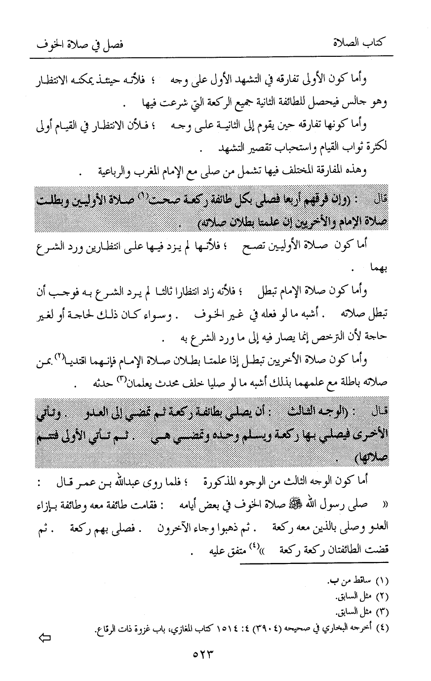 أما كون الوجه الثالث من الوجوه المذكورة؛ فلما روى عبدالله بن عمر قال: «صلى رسول الله صلى الله عليه وسلم صلاة الخوف في بعض أيامه: فقامت طائفة معه وطائفة بإزاء العدو وصلى بالذين معه ركعة. ثم ذهبوا وجاء الآخرون. فصلى بهم ركعة. ثم قضت الطائفتان ركعة ركعة» (¬4) متفق عليه.