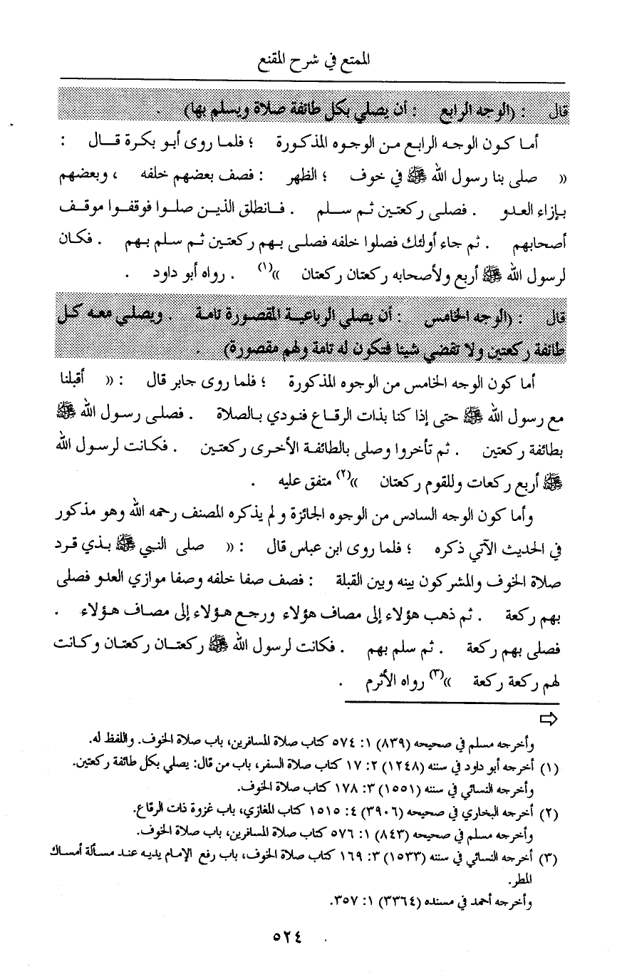 أما كون الوجه الرابع من الوجوه المذكورة؛ فلما روى أبو بكرة قال: «صلى بنا رسول الله صلى الله عليه وسلم في خوفٍ؛ الظهر: فصف بعضهم خلفه، وبعضهم بإزاء العدو. فصلى ركعتين ثم سلم. فانطلق الذين صلوا فوقفوا موقف أصحابهم. ثم جاء أولئك فصلوا خلفه فصلى بهم ركعتين ثم سلم بهم. فكان لرسول الله صلى الله عليه وسلم أربع ولأصحابه ركعتان ركعتان» (¬1). رواه أبو داود.