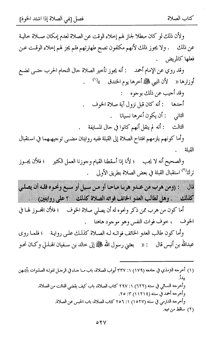 وأما كون طالب العدو الخائف فواته له الصلاة كذلك على روايةٍ؛ فلما روى عبدالله بن أنيس قال: «بعثني رسول الله صلى الله عليه وسلم إلى خالد بن سفيان الهذلي وكان نحو