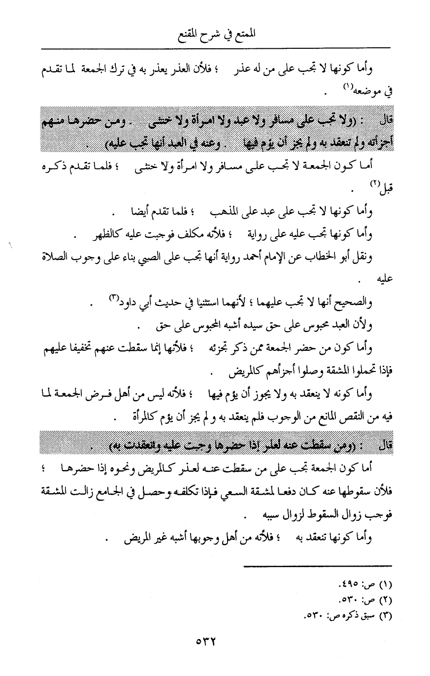 أما كون الجمعة لا تجب على مسافر ولا امرأة ولا خنثى؛ فلما تقدم ذكره قبل (¬2).
