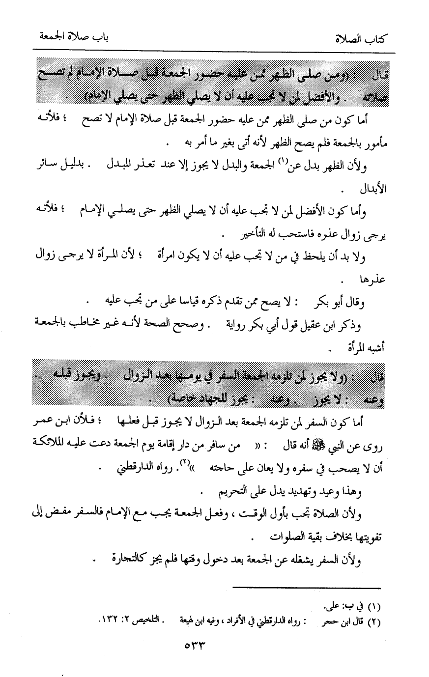 أما كون السفر لمن تلزمه الجمعة بعد الزوال لا يجوز قبل فعلها؛ فلأن ابن عمر روى عن النبي صلى الله عليه وسلم أنه قال: «من سافر من دار إقامة يوم الجمعة دعت عليه الملائكة أن لا يُصحب في سفره ولا يعان على حاجته» (¬2). رواه الدارقطني.
