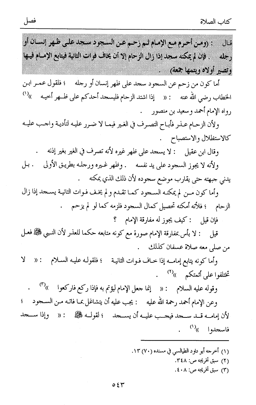 أما كون من زُحم عن السجود سجد على ظهر إنسان أو رجله؛ فلقول عمر ابن الخطاب رضي الله عنه: «إذا اشتد الزحام فليسجد أحدكم على ظهر أخيه» (¬1) رواه الإمام أحمد وسعيد بن منصور.