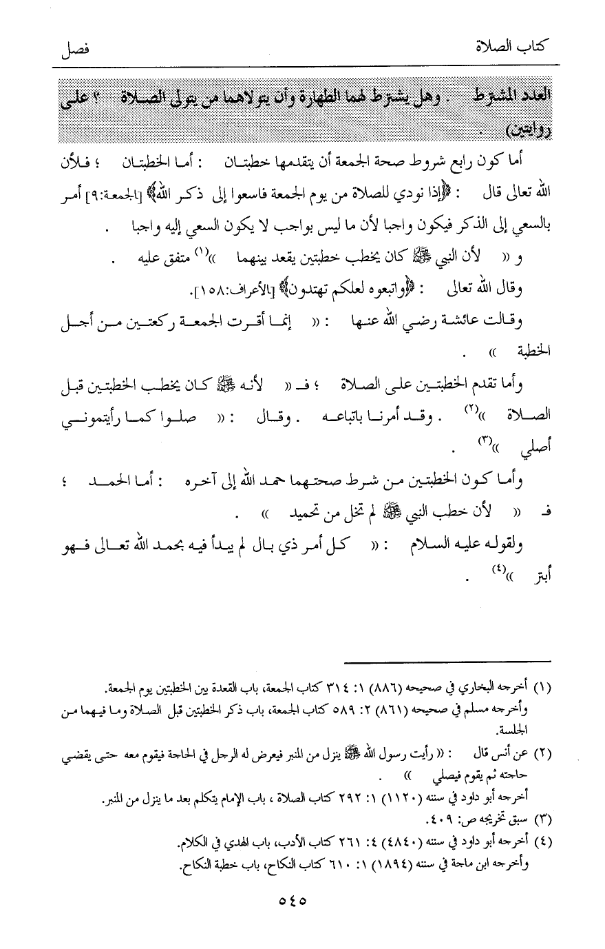 أما كون رابع شروط صحة الجمعة أن يتقدمها خطبتان: أما الخطبتان؛ فلأن الله تعالى قال: {إذا نودي للصلاة من يوم الجمعة فاسعوا إلى ذكر الله} [الجمعة: 9] أمر بالسعي إلى الذكر فيكون واجباً لأن ما ليس بواجب لا يكون السعي إليه واجباً.