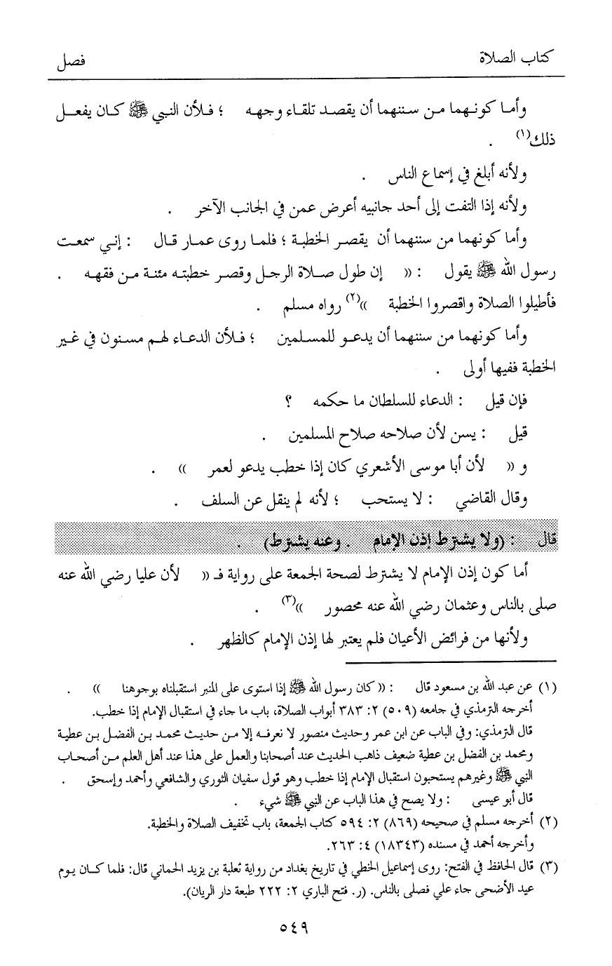 (¬1) عن عبد الله بن مسعود قال: «كان رسول الله صلى الله عليه وسلم إذا استوى على المنبر استقبلناه بوجوهنا».