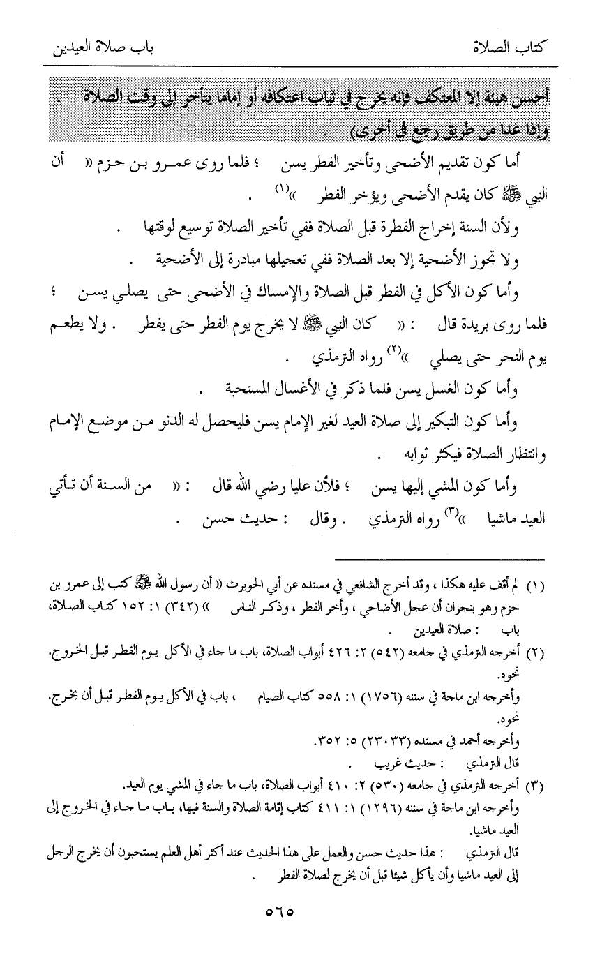 (¬3) أخرجه الترمذي في جامعه (530) 2: 410 أبواب الصلاة، باب ما جاء في المشي يوم العيد.