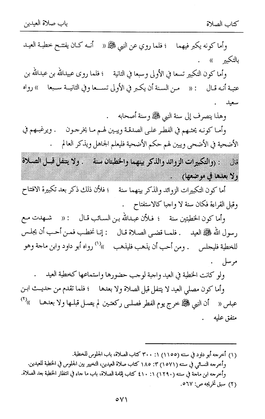قال: (والتكبيرات الزوائد والذكر بينهما والخطبتان سنة. ولا يتنفل قبل الصلاة ولا بعدها في موضعها).