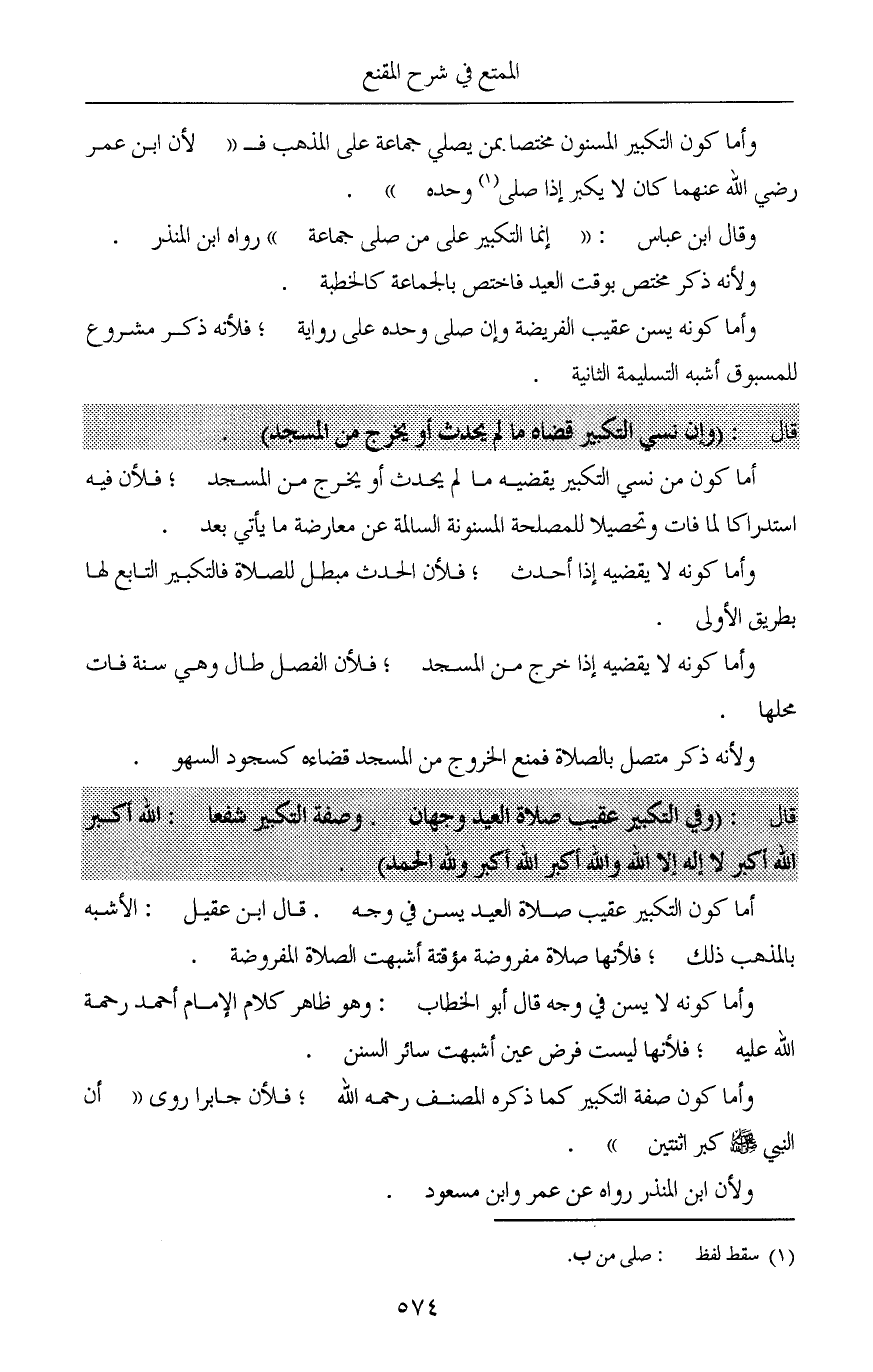 وأما كون التكبير المسنون مختصاً بمن يصلي جماعة على المذهب فـ «لأن ابن عمر رضي الله عنهما كان لا يكبر إذا صلى (¬1) وحده».