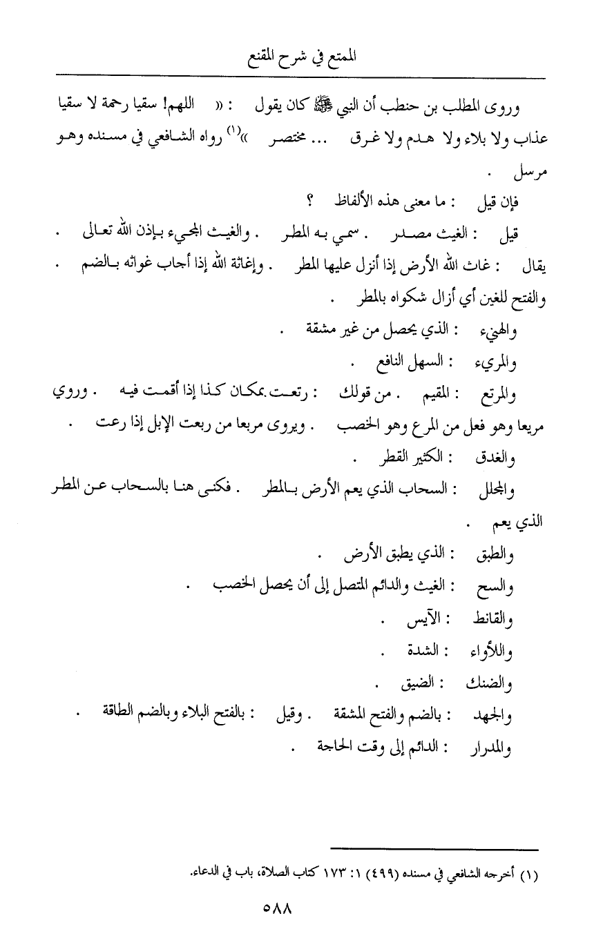وروى المطلب بن حنطب أن النبي صلى الله عليه وسلم كان يقول: «اللهم! سقيا رحمة لا سقيا عذاب ولا بلاء ولا هدم ولا غرق ... مختصر» (¬1) رواه الشافعي في مسنده وهو مرسل.