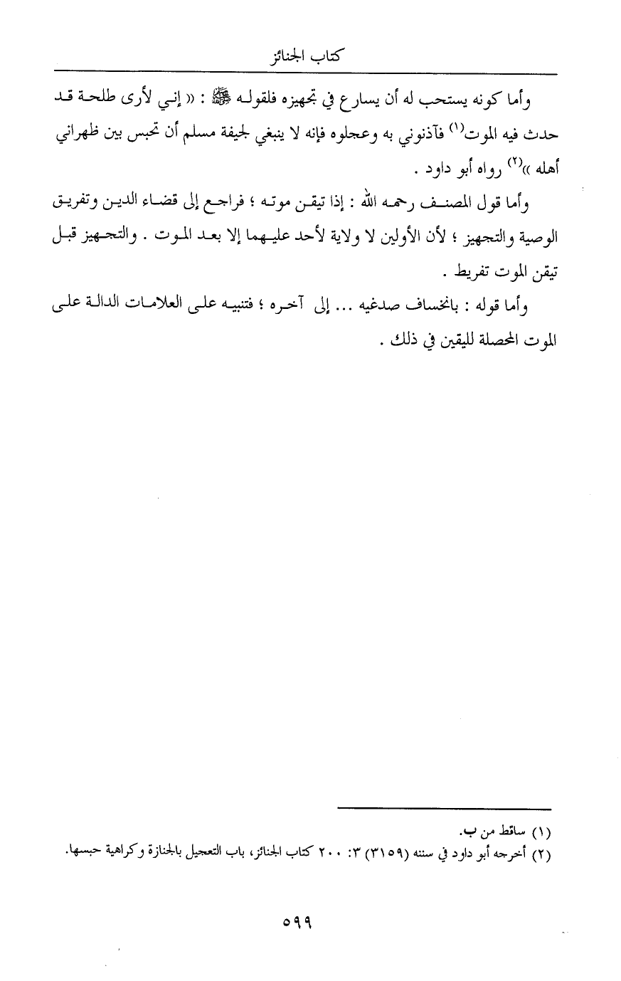 (¬2) أخرجه أبو داود في سننه (3159) 3: 200 كتاب الجنائز، باب التعجيل بالجنازة وكراهية حبسها.