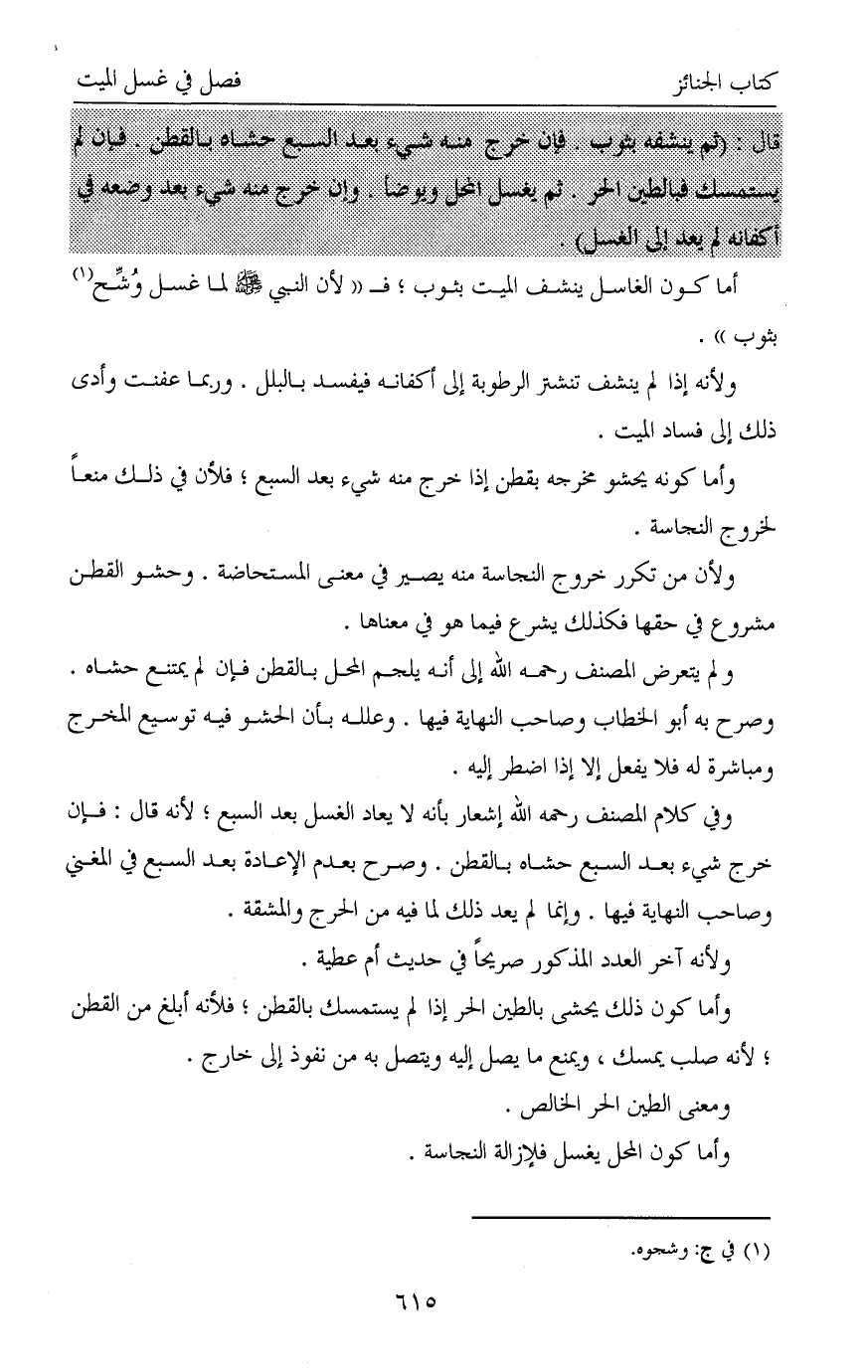 قال: (ثم ينشفه بثوب. فإن خرج منه شيء بعد السبع حشاه بالقطن. فإن لم يستمسك فبالطين الحر. ثم يغسل المحل ويوضأ. وإن خرج منه شيء بعد وضعه في أكفانه لم يعد إلى الغسل).