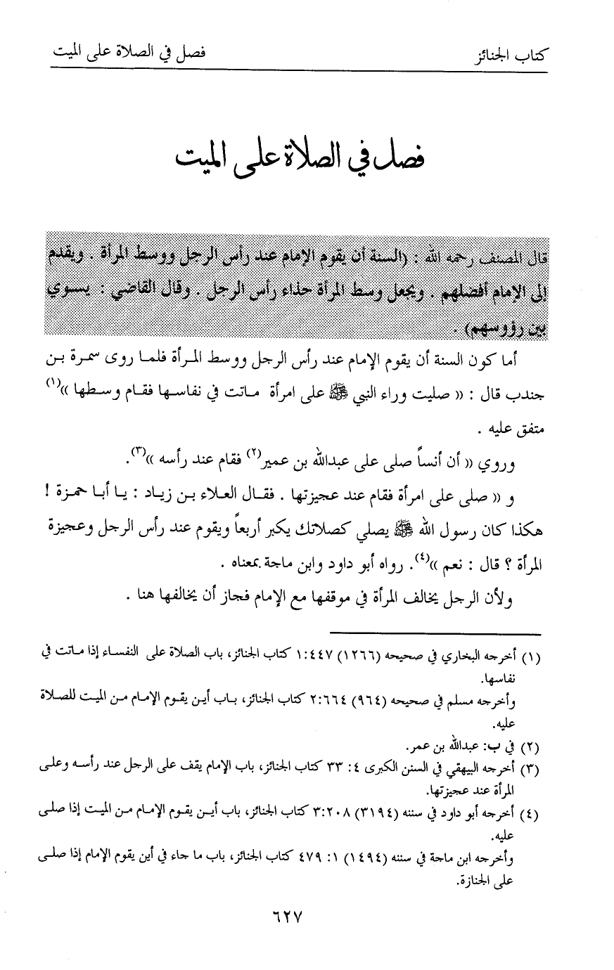 (¬4) أخرجه أبو داود في سننه (3194) 3: 208 كتاب الجنائز، باب أين يقوم الإمام من الميت إذا صلى عليه.