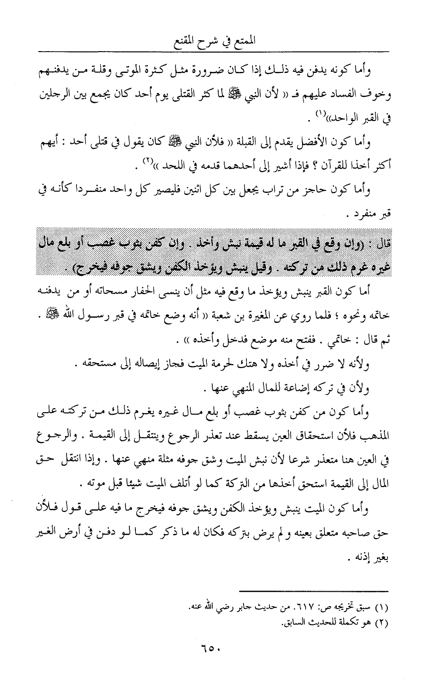 وأما كونه يدفن فيه ذلك إذا كان ضرورة مثل كثرة الموتى وقلة من يدفنهم وخوف الفساد عليهم فـ «لأن النبي صلى الله عليه وسلم لما كثر القتلى يوم أحد كان يجمع بين الرجلين في القبر الواحد» (¬1).
