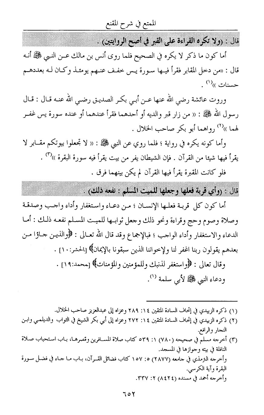 أما كون ما ذُكر لا يكره في الصحيح فلما روى أنس بن مالك عن النبي صلى الله عليه وسلم أنه قال: «من دخل المقابر فقرأ فيها سورة يس خُفف عنهم يومئذ وكان له بعددهم حسنات» (¬1).
