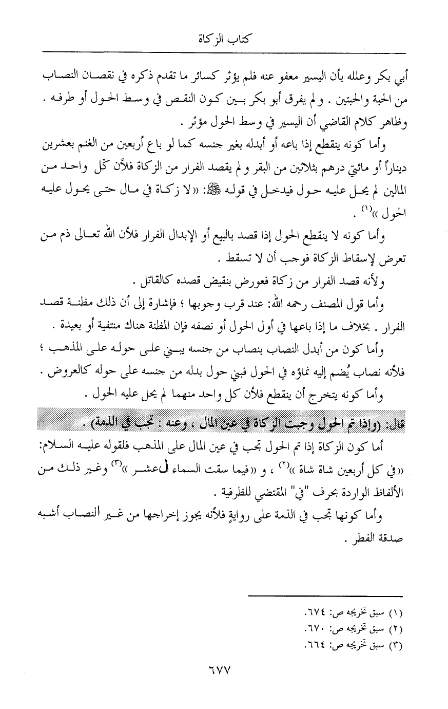 وأما كونه ينقطع إذا باعه أو أبدله بغير جنسه كما لو باع أربعين من الغنم بعشرين ديناراً أو مائتي درهم بثلاثين من البقر ولم يقصد الفرار من الزكاة فلأن كل واحد من المالين لم يحل عليه حول فيدخل في قوله صلى الله عليه وسلم: «لا زكاة في مال حتى يحول عليه الحول» (¬1).