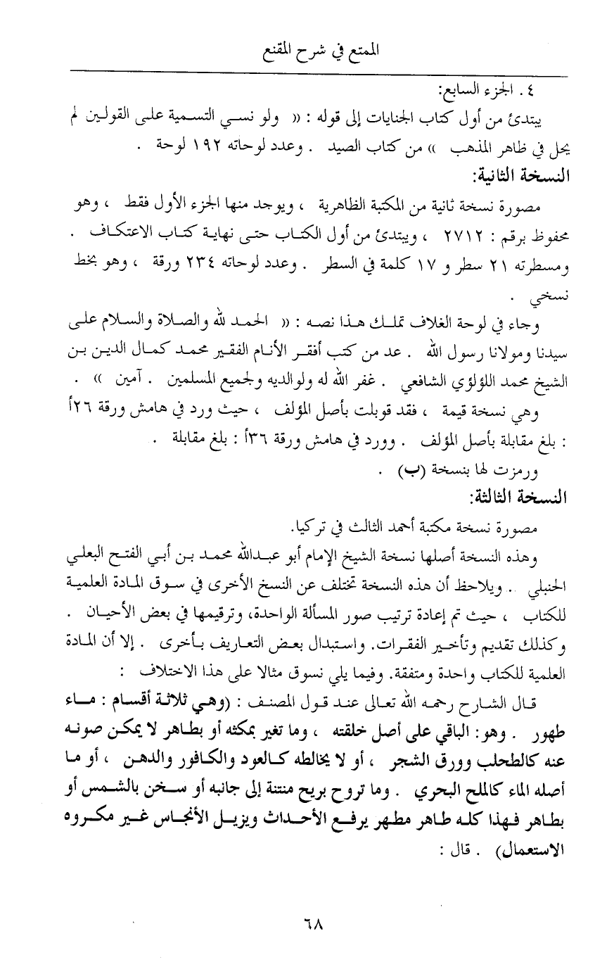 وهذه النسخة أصلها نسخة الشيخ الإمام أبو عبدالله محمد بن أبي الفتح البعلي الحنبلي. ويلاحظ أن هذه النسخة تختلف عن النسخ الأخرى في سوق المادة العلمية للكتاب، حيث تم إعادة ترتيب صور المسألة الواحدة، وترقيمها في بعض الأحيان. وكذلك تقديم وتأخير الفقرات. واستبدال بعض التعاريف بأخرى. إلا أن المادة العلمية للكتاب واحدة ومتفقة. وفيما يلي نسوق مثالاً على هذا الاختلاف: