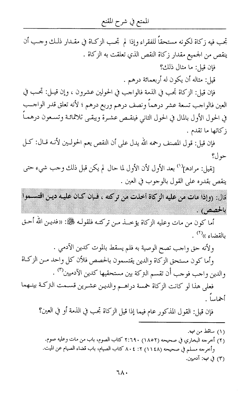 وأما كون مستحق الزكاة والدين يقتسمون بالحصص فلأن كل واحد من الزكاة والدين واجب فوجب أن تقسم التركة بين مستحقيها كدين الآدميين (¬3).