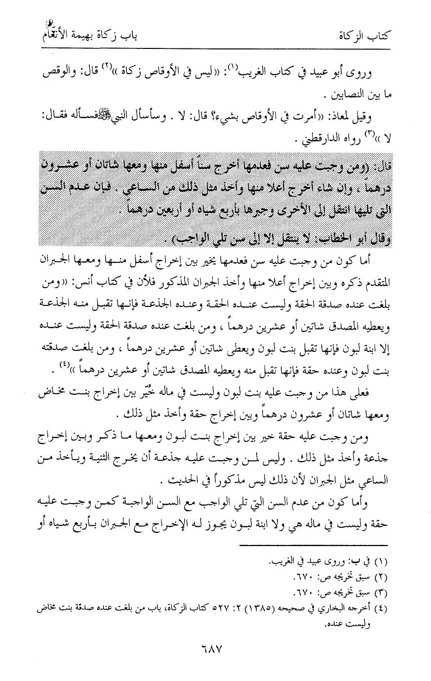 (¬4) أخرجه البخاري في صحيحه (1385) 2: 527 كتاب الزكاة، باب من بلغت عنده صدقة بنت مخاض وليست عنده.