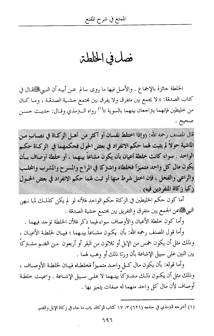 الخلطة جائزة بالإجماع. والأصل فيها ما روى سالم عن أبيه أن النبي صلى الله عليه وسلم قال في كتاب الصدقة: «لا يجمع بين متفرق ولا يفرق بين مجتمع خشية الصدقة، وما كان من خليطين فإنهما يتراجعان بينهما بالسوية» (¬1) رواه الترمذي وقال: حديث حسن صحيح.