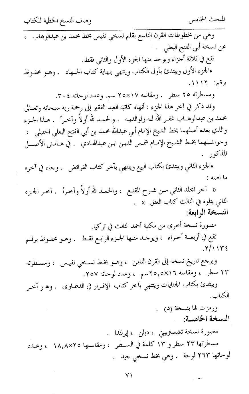 وهي من مخطوطات القرن التاسع بقلم نسخي نفيس بخط محمد بن عبدالوهاب، عن نسخة أبي الفتح البعلي.