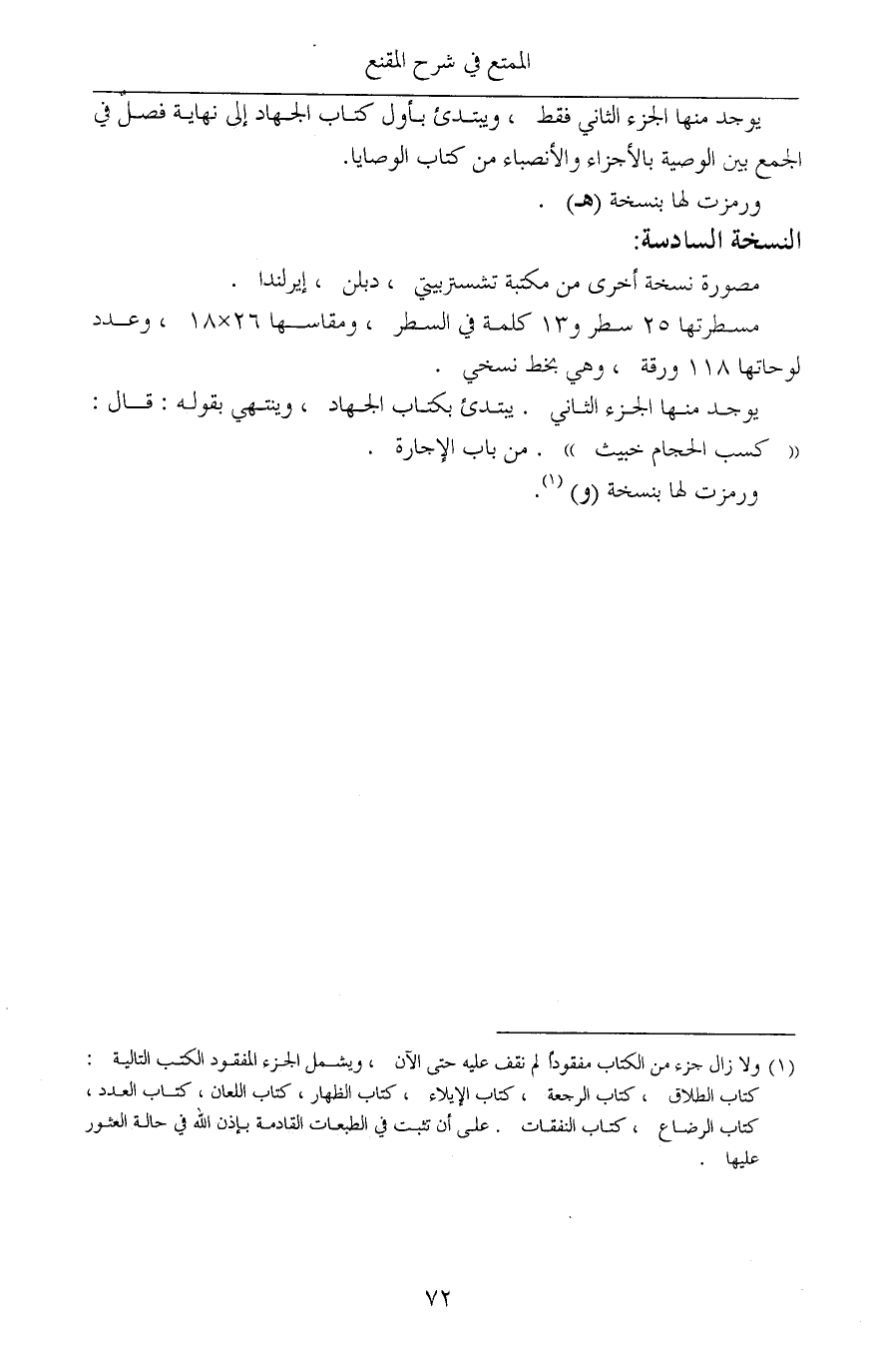 (¬1) ولا زال جزء من الكتاب مفقوداً لم نقف عليه حتى الآن، ويشمل الجزء المفقود الكتب التالية: كتاب الطلاق، كتاب الرجعة، كتاب الإيلاء، كتاب الظهار، كتاب اللعان، كتاب العدد، كتاب الرضاع، كتاب النفقات. على أن تثبت في الطبعات القادمة بإذن الله في حالة العثور عليها.