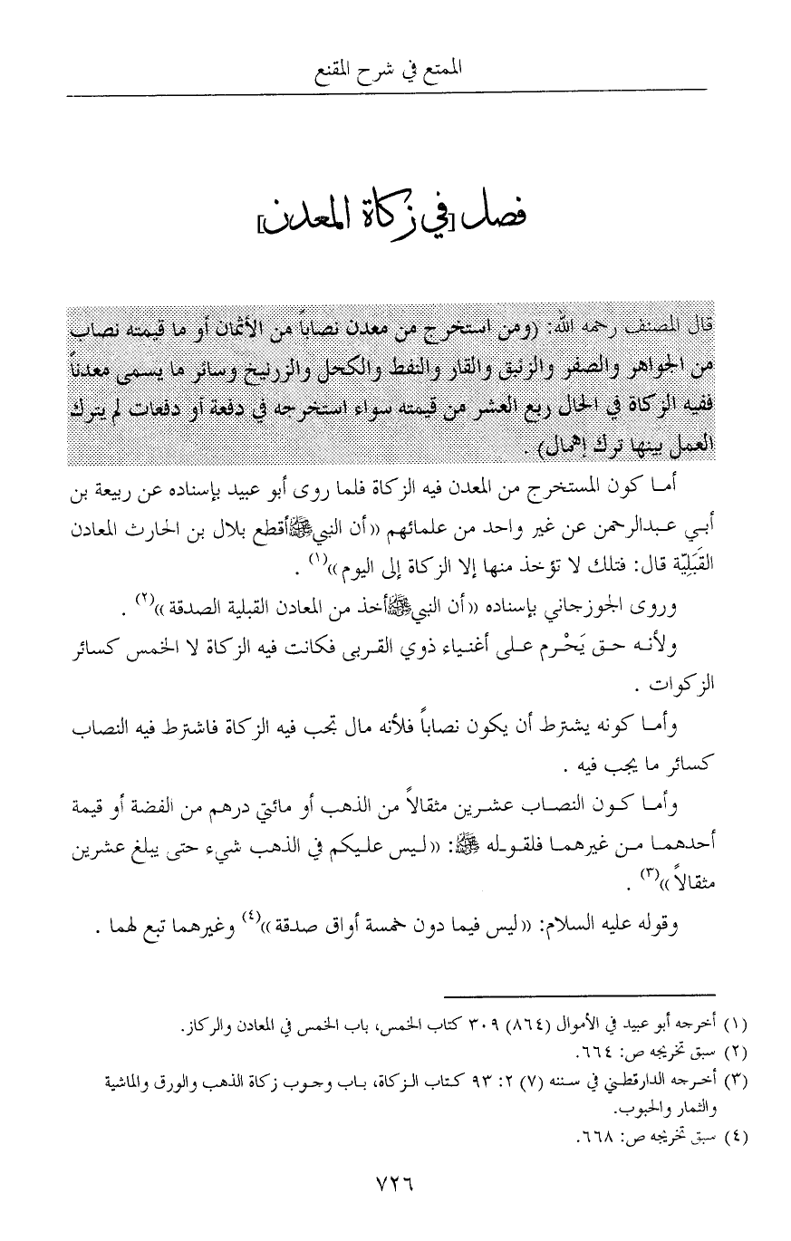أما كون المستخرج من المعدن فيه الزكاة فلما روى أبو عبيد بإسناده عن ربيعة بن أبي عبدالرحمن عن غير واحد من علمائهم «أن النبي صلى الله عليه وسلم أقطع بلال بن الحارث المعادن القَبَلِيّة قال: فتلك لا تؤخذ منها إلا الزكاة إلى اليوم» (¬1).