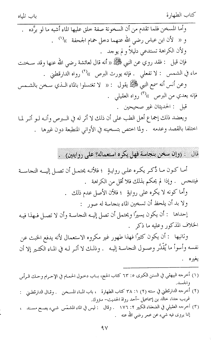 (¬2) أخرجه الدارقطني في سننه (2) 1: 38 كتاب الطهارة، باب الماء المسخن. وقال الدارقطني: غريب جدا، خالد بن إسماعيل -أحد رواة الحديث- متروك.