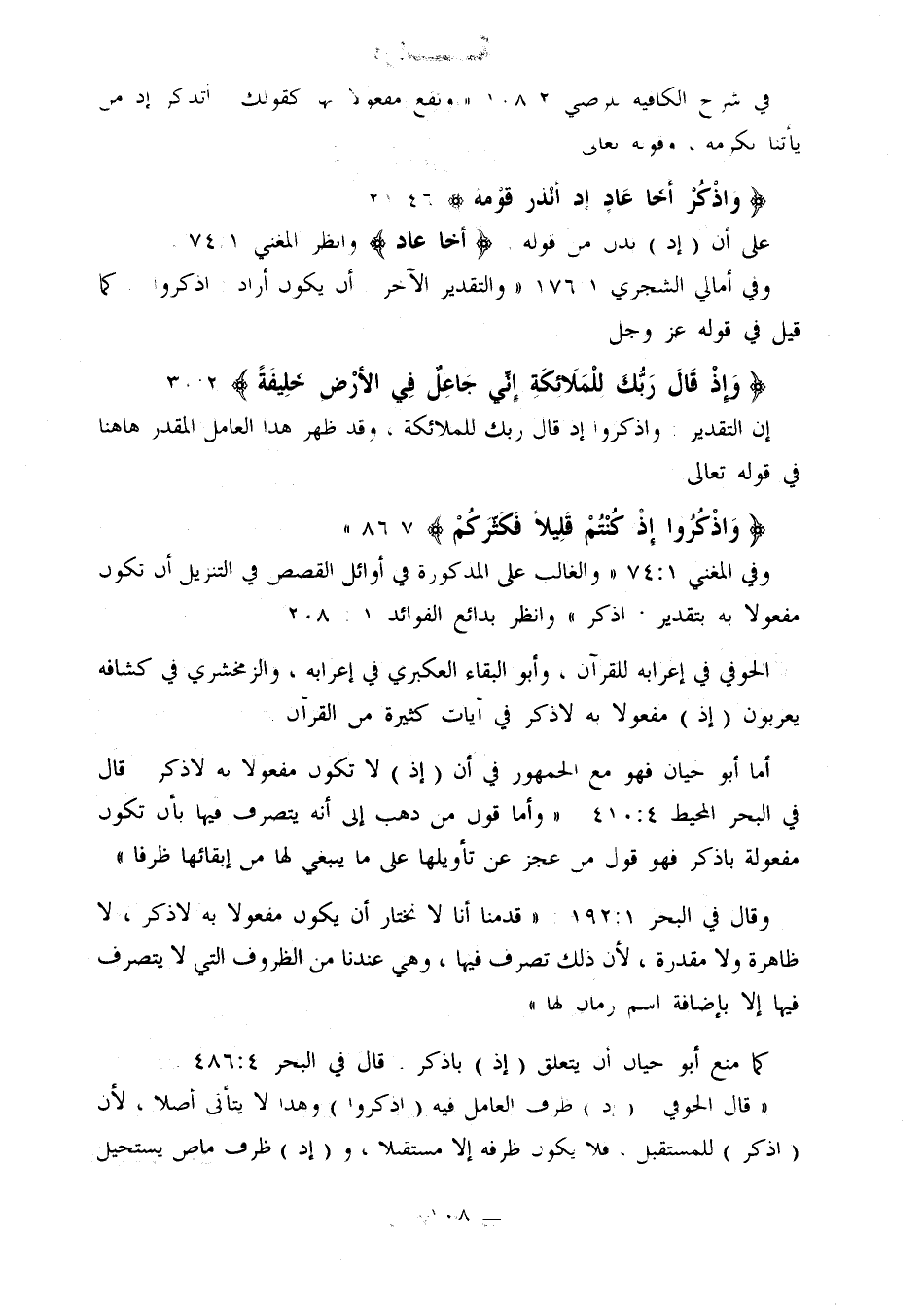 أما أبو حيان فهو مع الجمهور في أن (إذ) لا تكون مفعولاً به لاذكر. قال في البحر المحيط 4: 410: «وأما قول من ذهب إلى أنه يتصرف فيها بأن تكون معفولة باذكر فهو قول من عجز عن تأويلها على ما ينبغي لها من إبقائها ظرفًا».