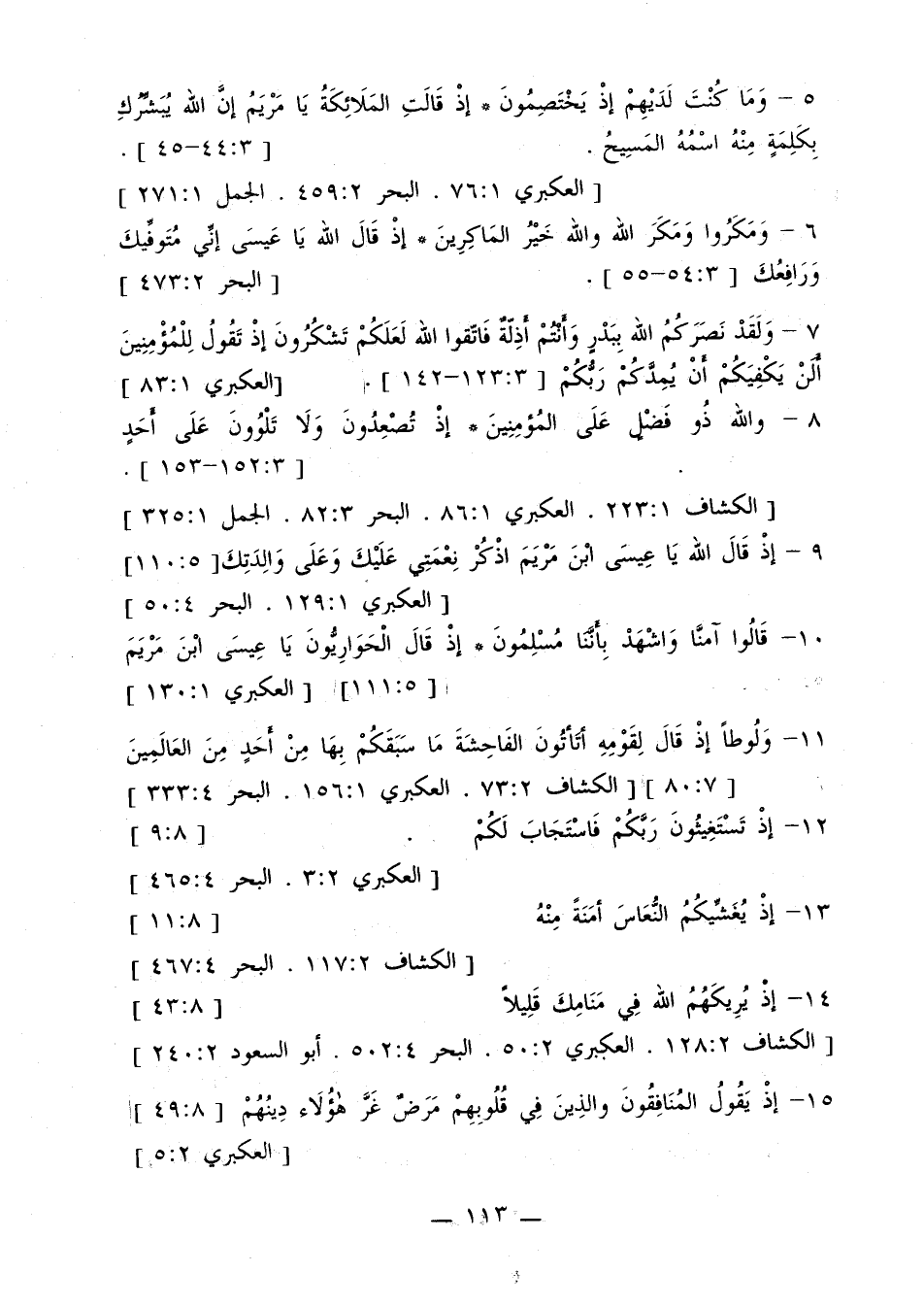 7 - {ولقد نصركم الله ببدر وأنتم أذلة فاتقوا الله لعلكم تشكرون إذ تقول للمؤمنين ألن يكفيكم أن يمدكم ربكم} [3: 123 - 142] [العكبري 1: 83].