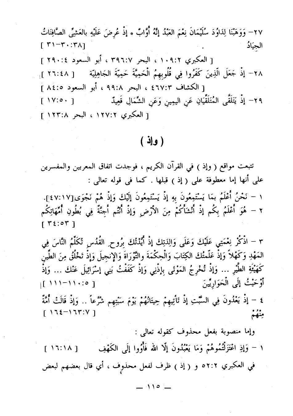 1 - {وَإِذِ اعْتَزَلْتُمُوهُمْ وَمَا يَعْبُدُونَ إِلَّا اللَّهَ فَأْوُوا إِلَى الْكَهْفِ} [18: 16]. في العكبري 2: 52 و (إذ) ظرف لفعل محذوف، أي قال بعضهم لبعض