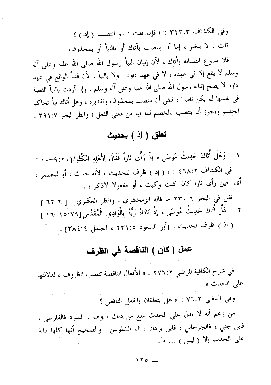 1 - {وهل أتاك حديث موسى * إذ رأى نارًا فقال لأهله امكثوا} [20: 9 - 10]. في الكشاف 2: 468: «(إذ) ظرف للحديث، لأنه حدث، أو لمضمر، أي حين رأى نارًا كان كيت وكيت، أو مفعولاً لاذكر».