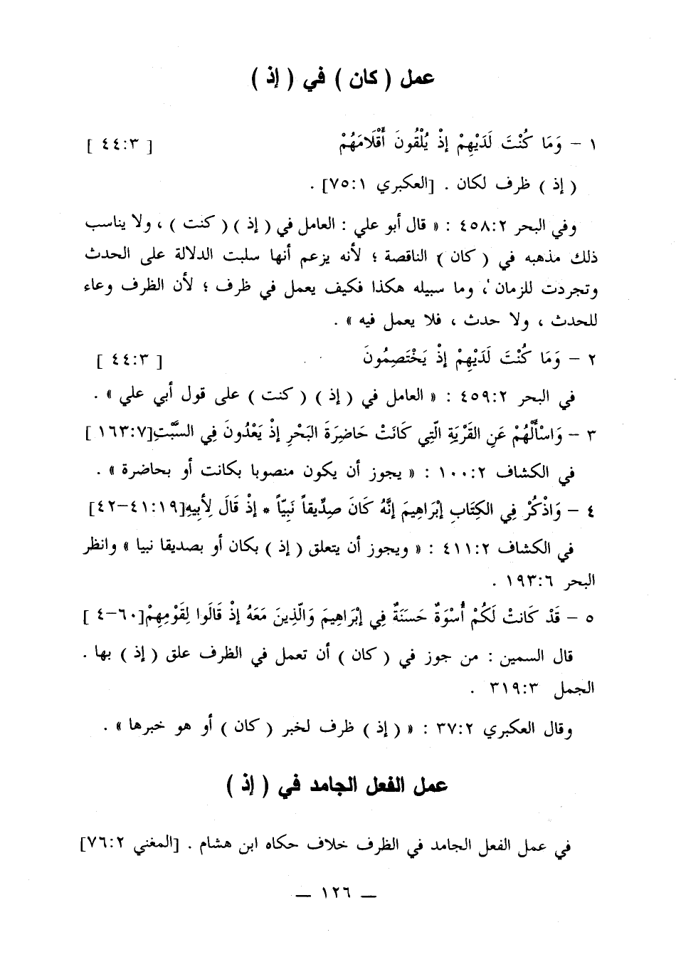3 - {واسألهم عن القرية التي كانت حاضرة البحر إذ يعدون في السبت} [7: 163]. في الكشاف 2: 100: «يجوز أن يكون منصوبًا بكانت أو بحاضرة».