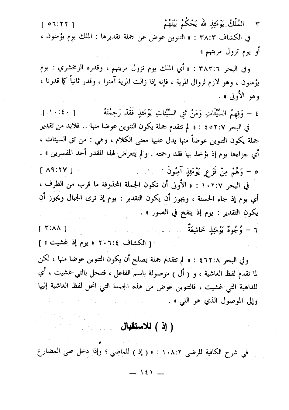 وفي البحر 8: 462: «لم تتقدم جملة يصلح أن يكون التنوين عوضًا منها، لكن لما تقدم لفظ الغاشية، و (أل) موصولة باسم الفاعل، فتنحل بالتي غشيت، أي للداهية التي غشيت، فالتنوين عوض من هذه الجملة التي انحل لفظ الغاشية إليها وإلى الموصول الذي هو التي».