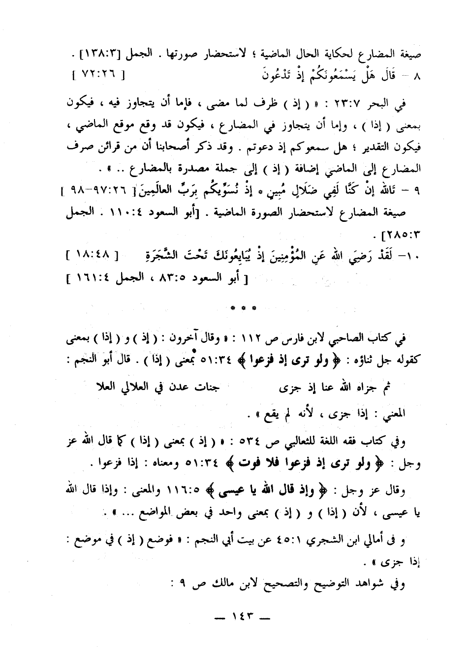 وفي كتاب فقه اللغة للثعالبي ص 534: «(إذ) بمعنى (إذا) كما قال الله عز وجل: {ولو ترى إذ فزعوا فلا فوت} 34: 51 ومعناه: إذا فزعوا.