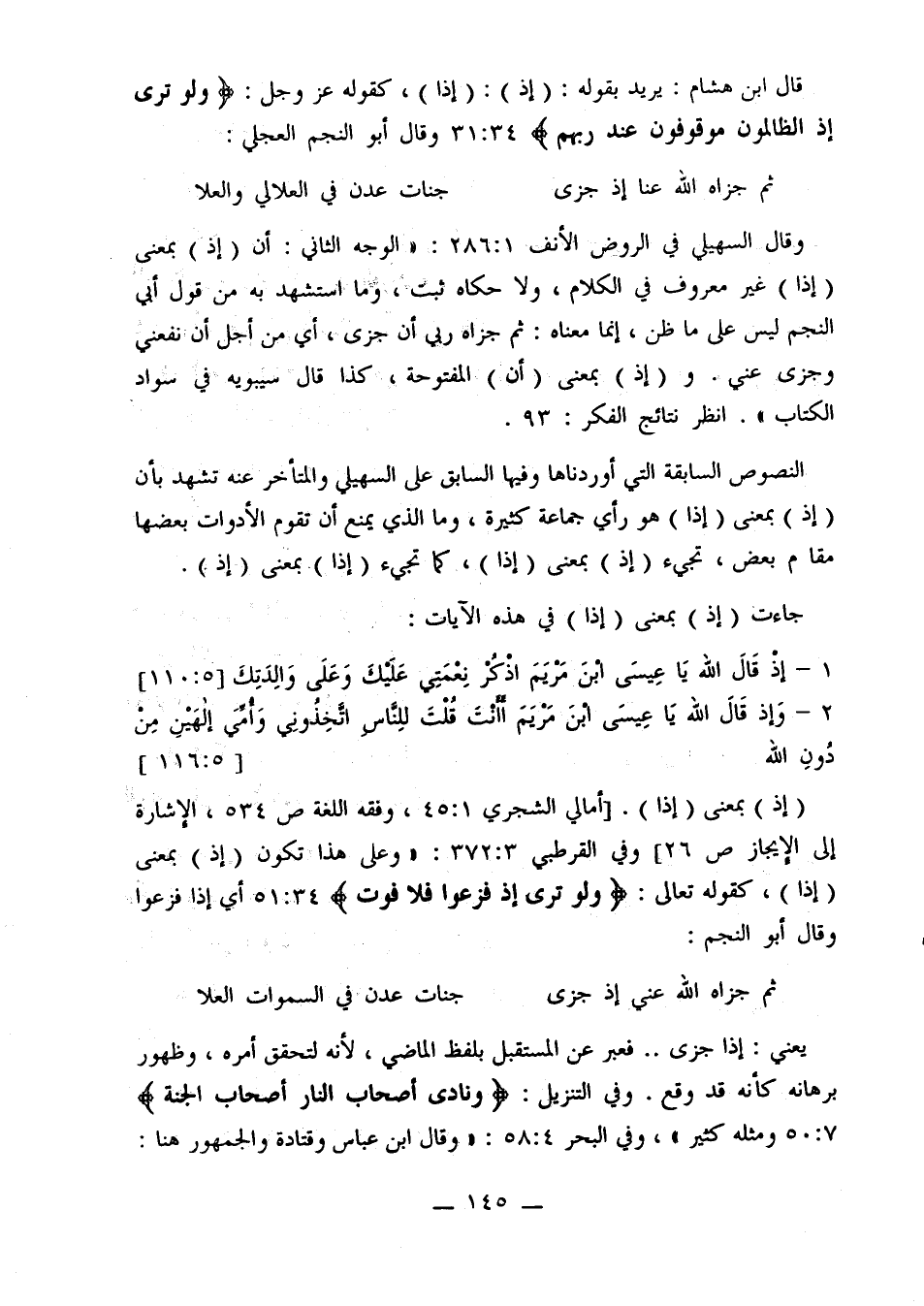وقال السهيلي في الروض الأنف 1: 286: «الوجه الثاني: أن (إذ) بمعنى (إذا) غير معروف في الكلام، ولا حكاه ثبت، وما استشهد به من قول أبي النجم ليس على ما ظن، إنما معناه: ثم جزاه ربي أن جزى، أي من أجل أن نفعني وجزى عني. و (إذ) بمعنى (أن) المفتوحة، كذا قال سيبويه في سواد الكتاب». انظر نتائج الفكر: 93.