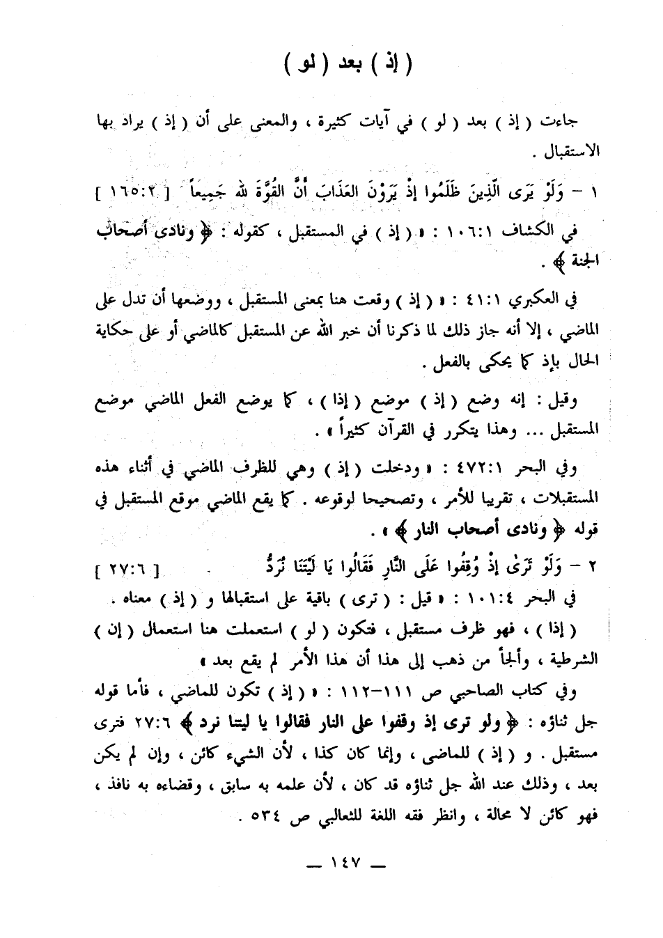 وفي كتاب الصحابي ص 111 - 112: «(إذ) تكون للماضي، فأما قوله جل ثناؤه: {ولو ترى إذ وقفوا على النار فقالوا يا ليتنا نرد} 6: 27 فترى مستقبل. و (إذ) للماضي، وإنما كان كذا، لأن الشيء كائن، وإن لم يكن بعد، وذلك عند الله جل ثناؤه قد كان، لأن علمه به سابق، وقضاءه به نافذ، فهو كائن لا محالة، وانظر فقه اللغة للثعالبي ص 534.