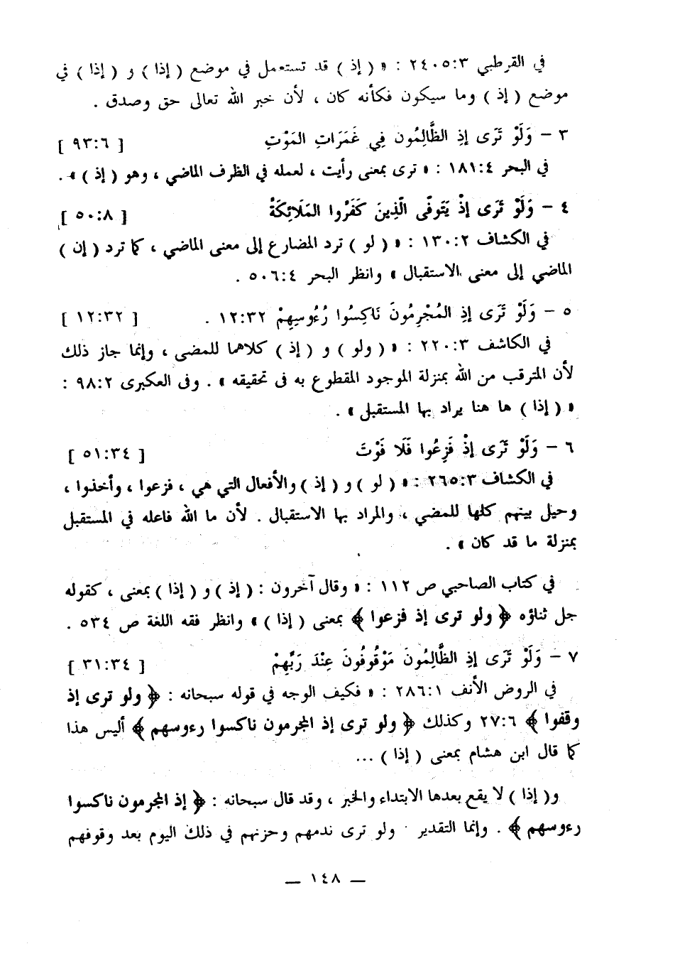في الروض الأنف 1: 286: «فكيف الوجه في قوله سبحانه: {ولو ترى إذ وقفوا} 6: 27 وكذلك {ولو ترى إذ المجرمون ناكسوا رءوسهم} أليس هذا كما قال ابن هشام بمعنى (إذا) ...