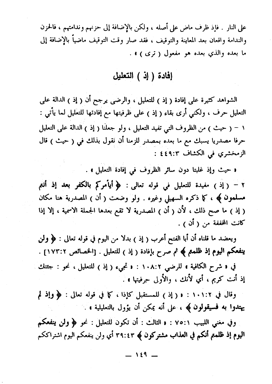 وفي مغني اللبيب 1: 75: «الثالث: أن تكون للتعليل: نحو {وَلَنْ يَنْفَعَكُمُ الْيَوْمَ إِذْ ظَلَمْتُمْ أَنَّكُمْ فِي الْعَذَابِ مُشْتَرِكُونَ} 43: 39 أي ولن ينفعكم اليوم اشتراككم