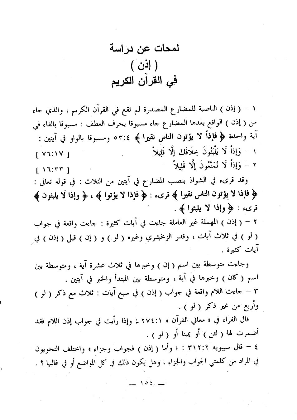 1 - (إذن) الناصبة للمضارع المصدرة لم تقع في القرآن الكريم، والذي جاء من (إذن) الواقع بعدها المضارع جاء مسبوقًا بحرف العطف: مسبوقًا بالفاء في آية واحدة {فَإِذًا لَا يُؤْتُونَ النَّاسَ نَقِيرًا} 4: 53 ومسبوقًا بالواو في آيتين: