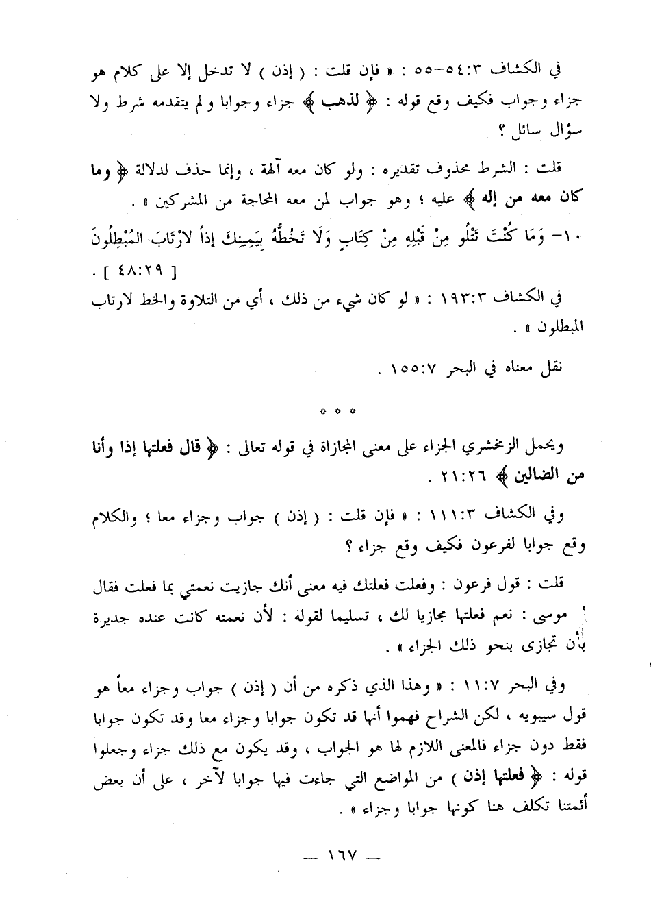 وفي الكشاف 3: 111: «فإن قلت: (إذن) جواب وجزاء معا؛ والكلام وقع جوابا لفرعون فكيف وقع جزاء؟