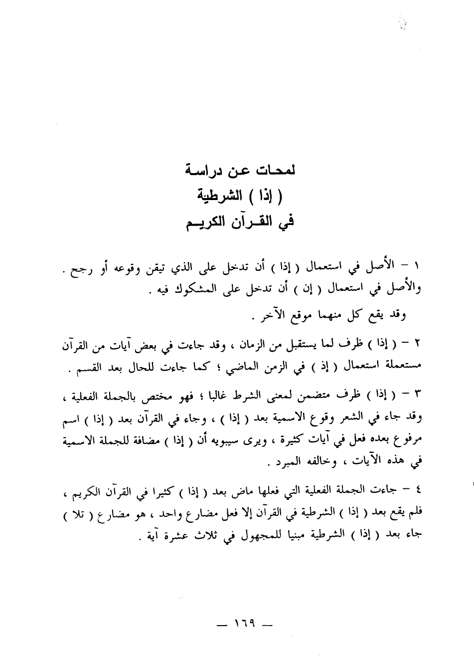 4 - جاءت الجملة الفعلية التي فعلها ماض بعد (إذا) كثيرًا في القرآن الكريم، فلم يقع بعد (إذا) الشرطية في القرآن إلا فعل مضارع واحد، هو مضارع (تلا) جاء بعد (إذا) الشرطية مبنيًا للمجهول في ثلاثة عشرة آية.