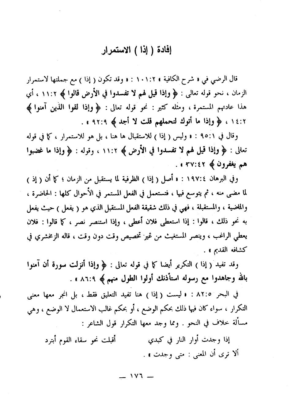 قال الرضي في «شرح الكافية» 2: 101: «وقد تكون (إذا) مع جملتها لاستمرار الزمان، نحو قوله تعالى: {وَإِذَا قِيلَ لَهُمْ لَا تُفْسِدُوا فِي الْأَرْضِ قَالُوا} 2: 11، أي هذا عادتهم المستمرة، ومثله كثير: نحو قوله تعالى: {وَإِذَا لَقُوا الَّذِينَ آَمَنُوا} 2: 14، {إِذَا مَا أَتَوْكَ لِتَحْمِلَهُمْ قُلْتَ لَا أَجِدُ} 9: 92».