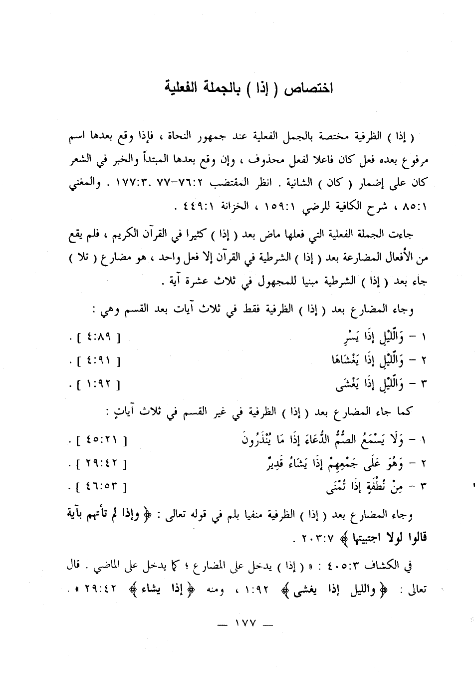 في الكشاف 3: 405: «(إذا) يدخل على المضارع؛ كما يدخل على الماضي. قال تعالى: {وَاللَّيْلِ إِذَا يَغْشَى} 92: 1، ومنه {إِذَا يَشَاءُ} 42: 29».