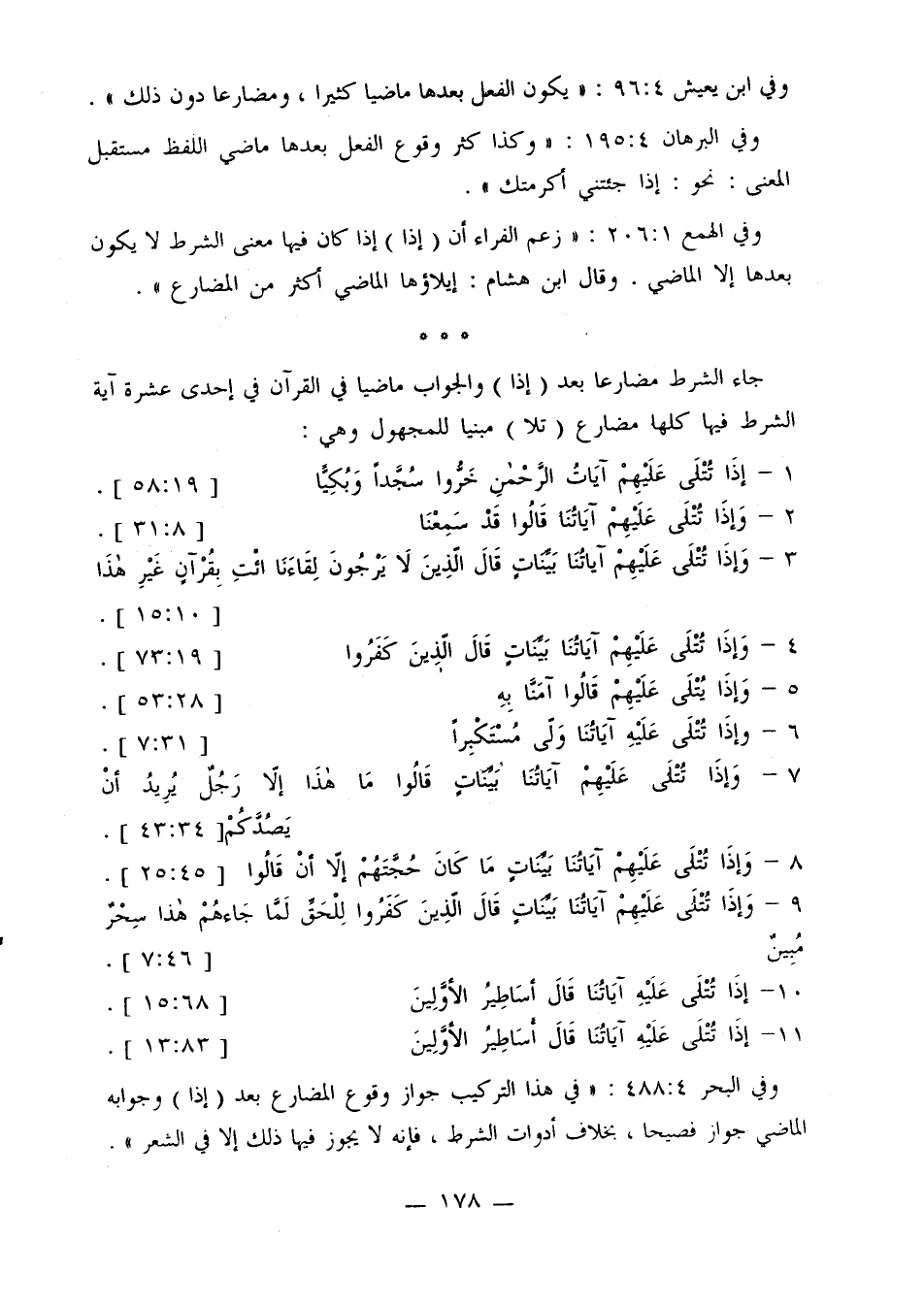 جاء الشرط مضارعًا بعد (إذا) والجواب ماضيًا في القرآن في إحدى عشرة آية الشرط فيها كلها مضارع (تلا) مبنيًا للمجهول وهي:
