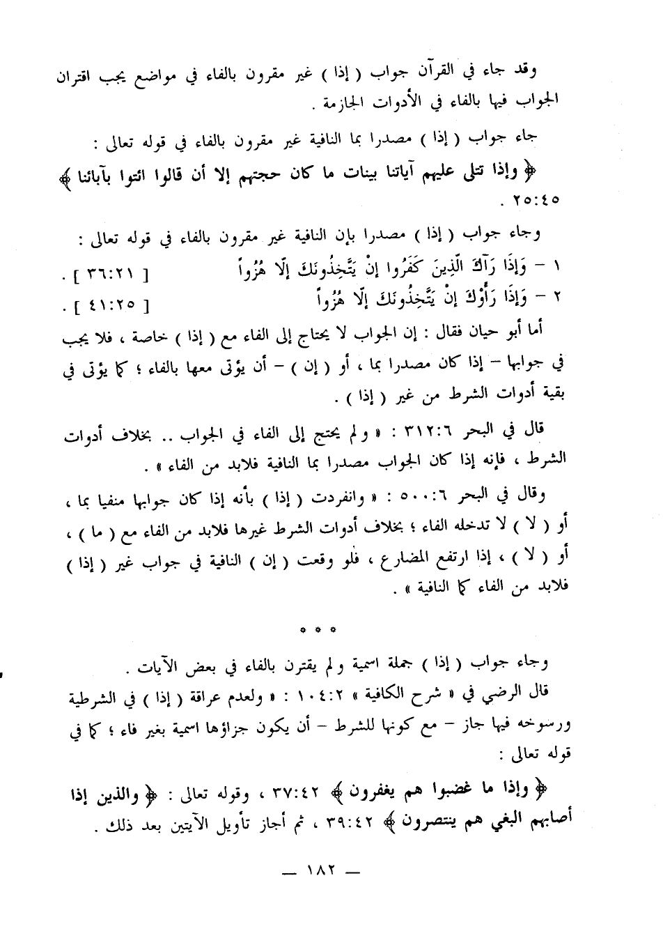 وقال في البحر 5: 500: «وانفردت (إذا) بأنه إذا كان جوابها منفيًا بما، أو (لا) لا تدخله الفاء؛ بخلاف أدوات الشرط غيرها فلابد من الفاء مع (ما)، أو (لا)، إذا ارتفع المضارع، فلو وقعت (إن) النافية في جواب غير (إذا) فلابد من الفاء كما النافية».