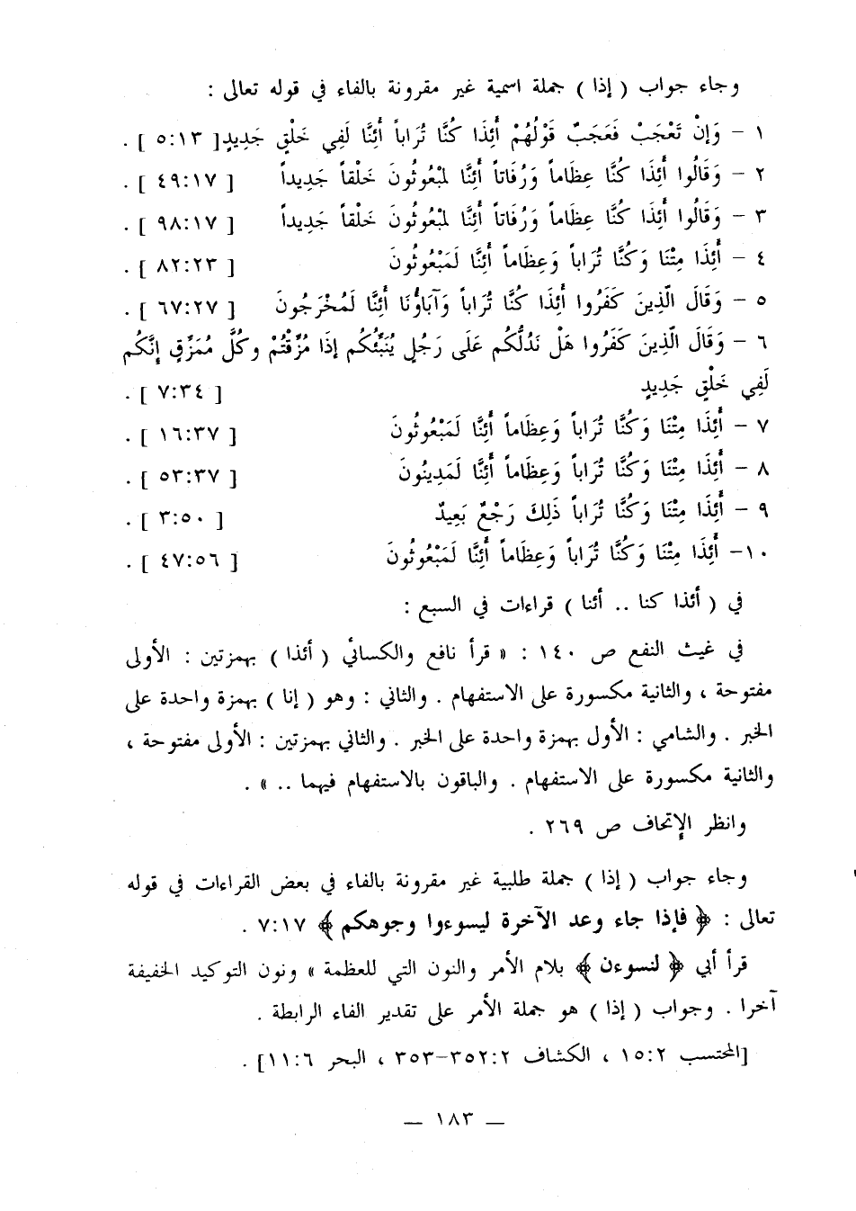 وجاء جواب (إذا) جملة طلبية غير مقرونة بالفاء في بعض القراءات في قوله تعالى: {فإذا جاء وعد الآخرة ليسوءوا وجوهكم} 17: 7.