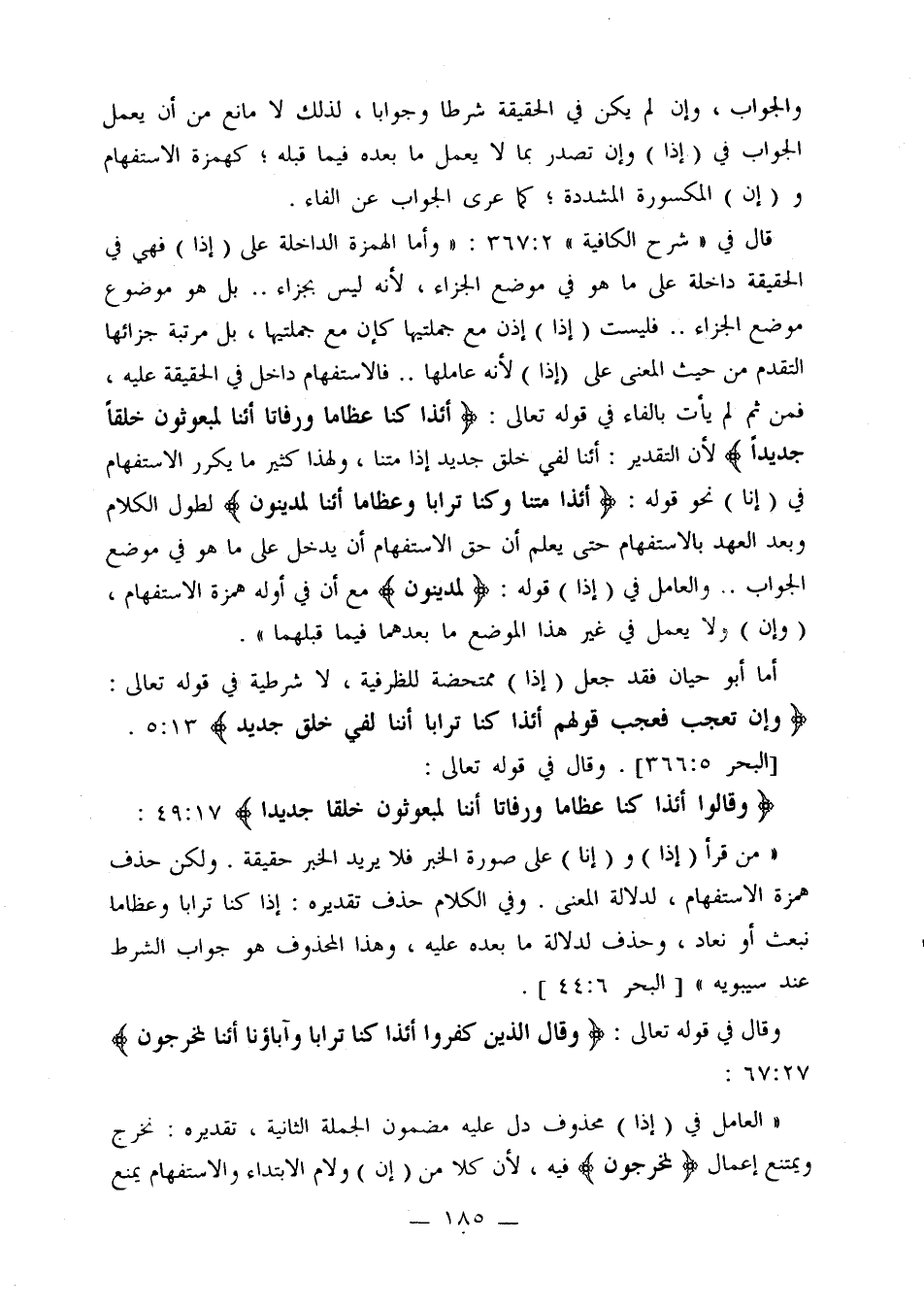 أما أبو حيان فقد جعل (إذا) ممتحضة للظرفية، لا شرطية في قوله تعالى: {وإن تعجب فعجب قولهم أئذا كنا ترابا أننا لفي خلق جديد} 13: 5. [البحر 5: 366]. وقال في قوله تعالى:
